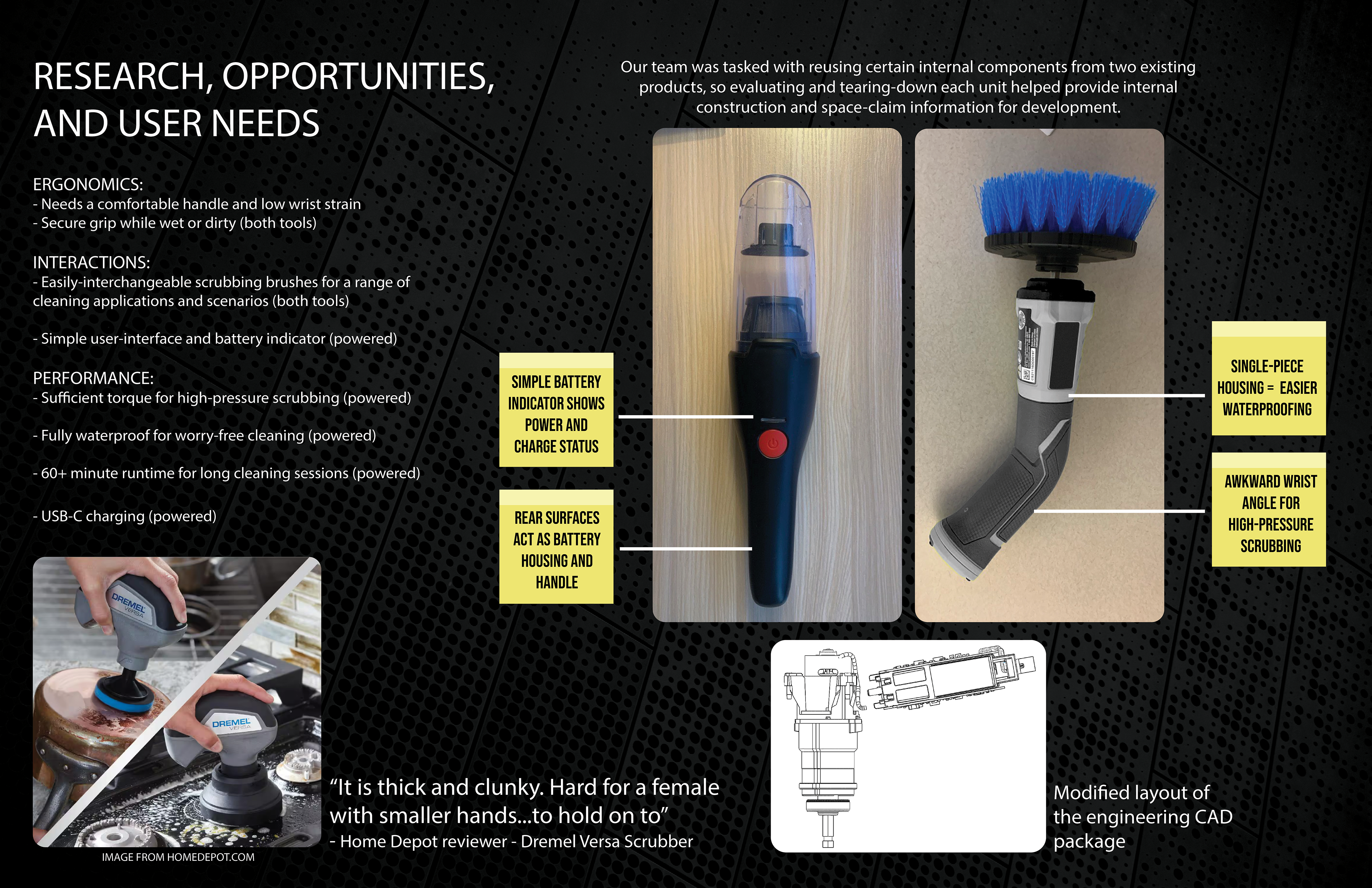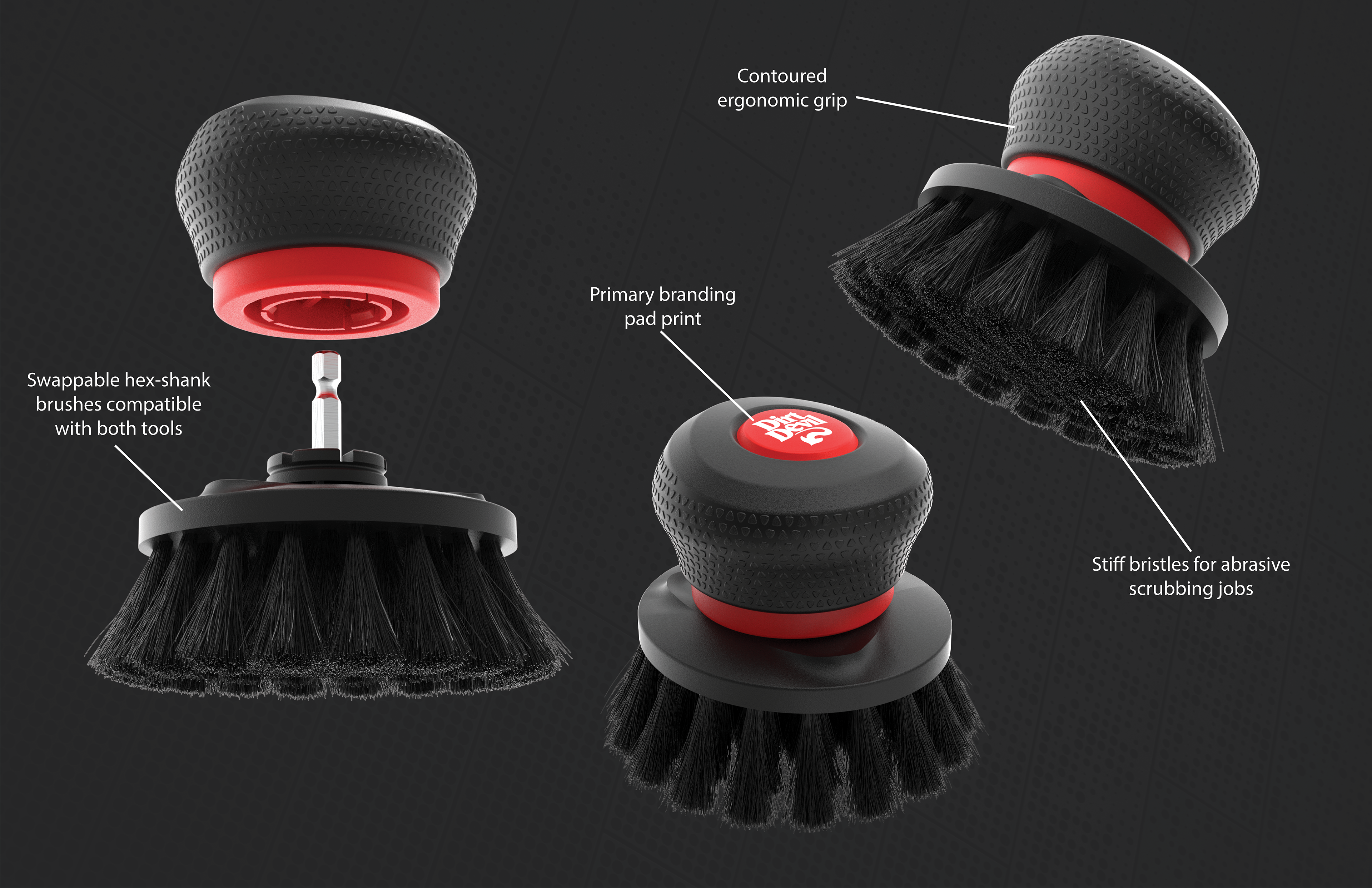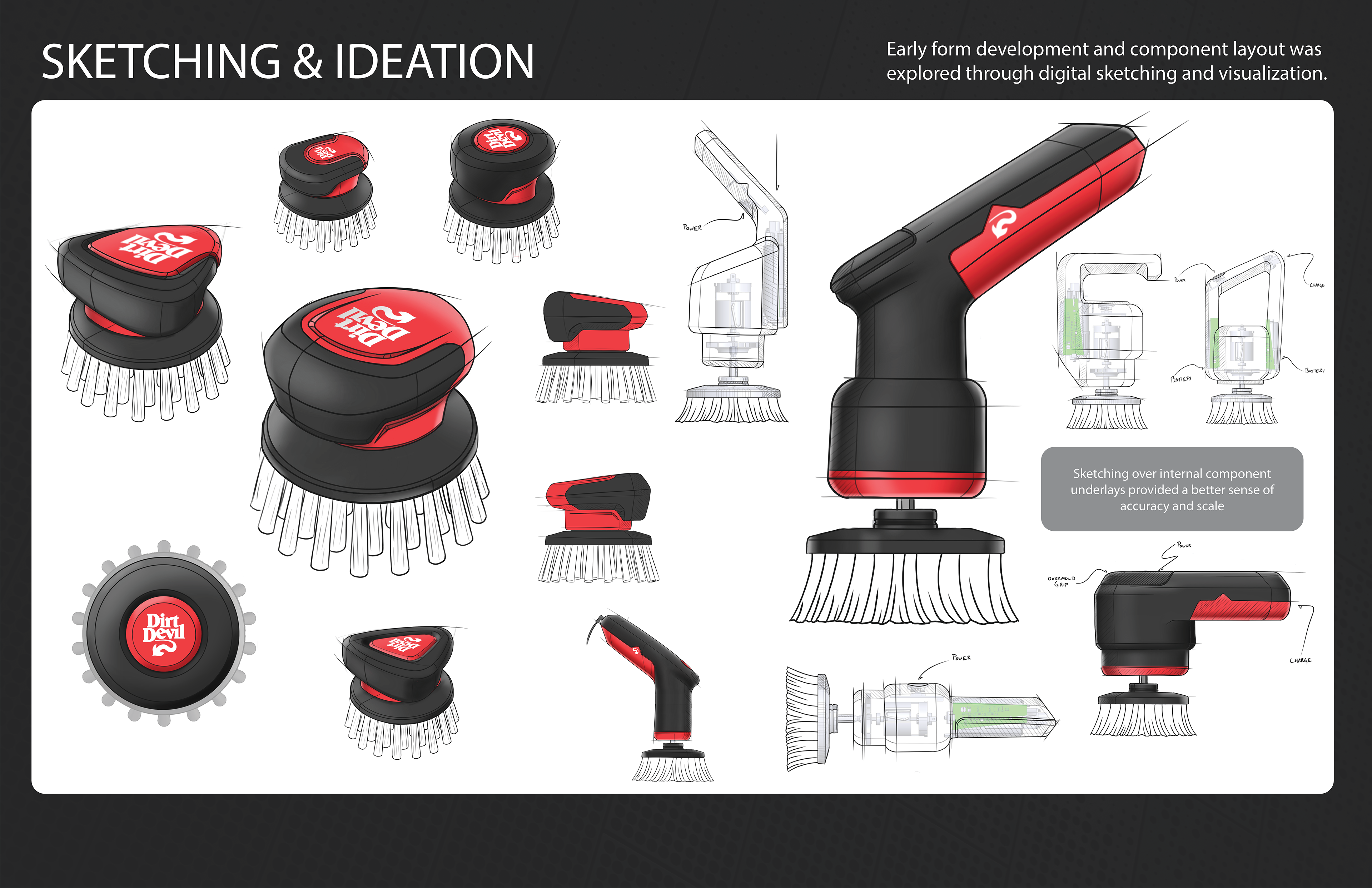 BRIEF: Support Dirt Devil’s expansion into manual cleaning with the development of two scrubbing tools: One tool needs to be a comfortable, manual scrub brush for entry-level cleaning, and the second will be a battery powered, fully waterproof scrubber for effortless deep-cleaning.